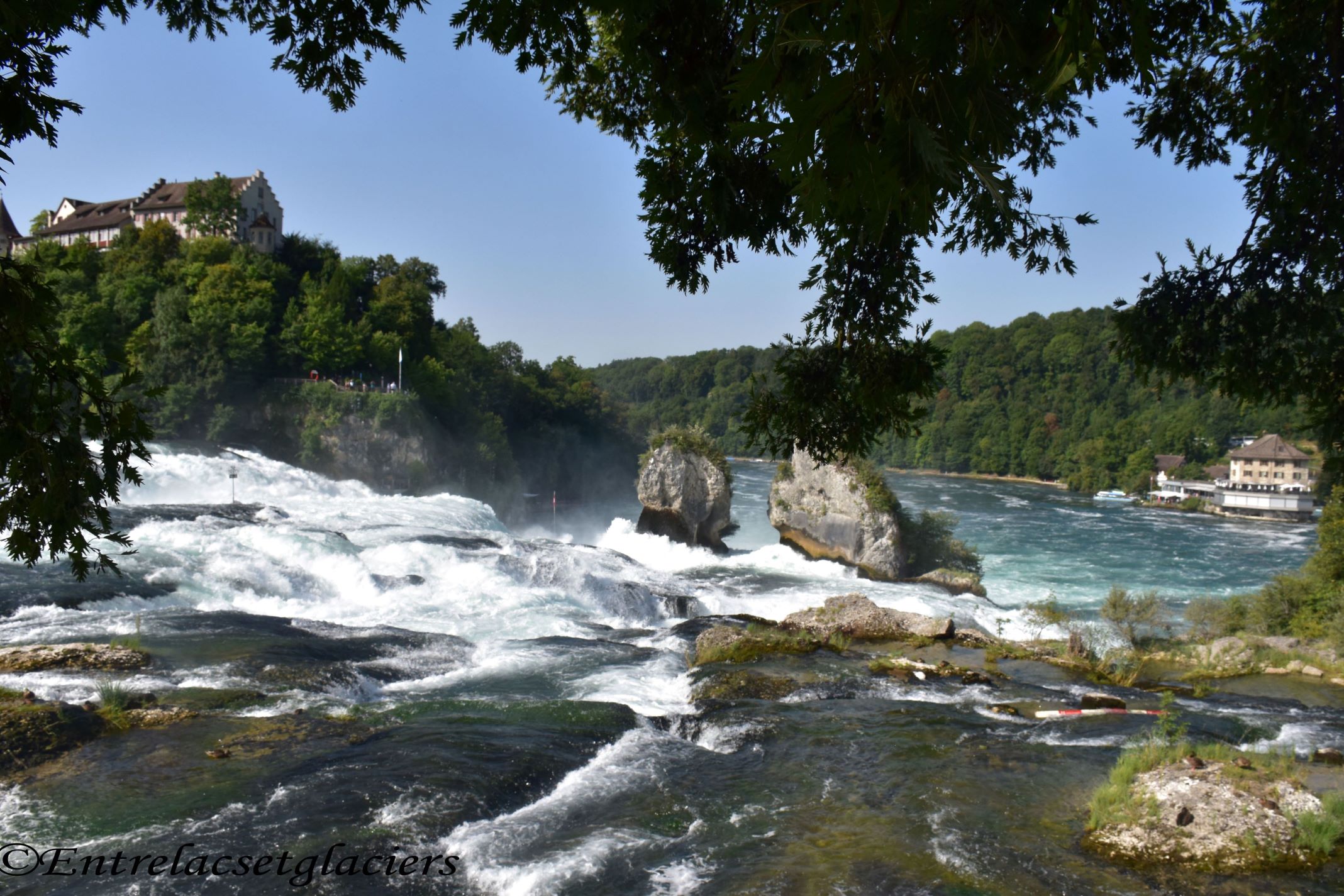 A l'extremité ouest du lac se situe la jolie vieille ville de Stein am Rhein (à visiter absolument), où le Haut Rhin continue sa traversée. A Schaffhouse il atteint une largeur de 150 m et les chutes du Rhin (photo ci-dessus) sont spectaculaires et superbes. Ces chutes sont classées comme étant la plus grande d'Europe avec une hauteur de 23m.